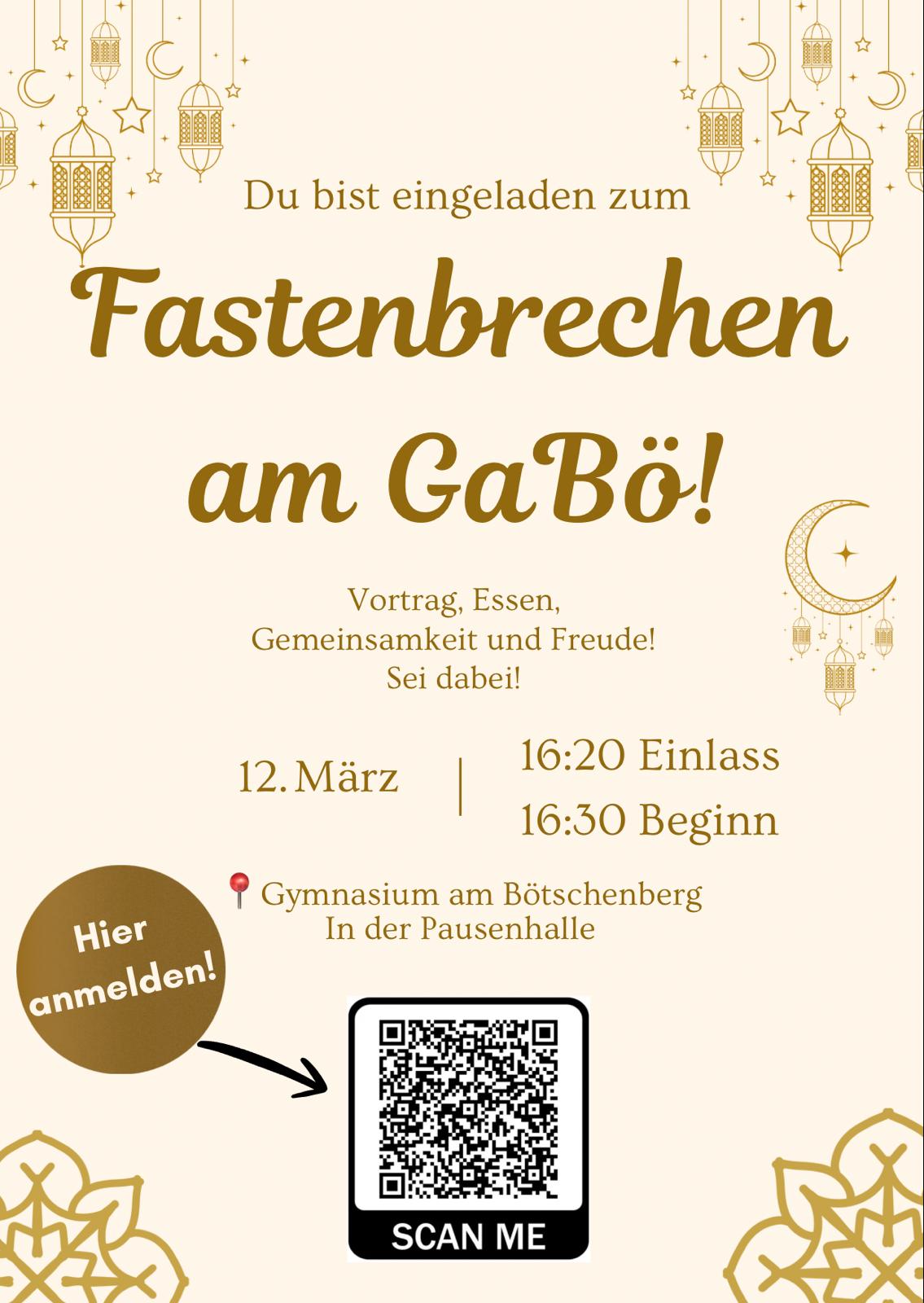 Am Donnerstag, den 12. März 2026, findet am Gymnasium am Bötschenberg ein gemeinsames Fastenbrechen statt. Die Veranstaltung richtet sich ausdrücklich an alle – unabhängig von Religionszugehörigkeit.